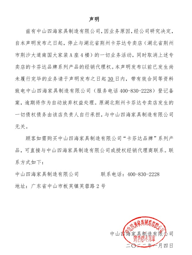 關于公司屬下品牌卡芬達家居及各子系列產品調價的通知
